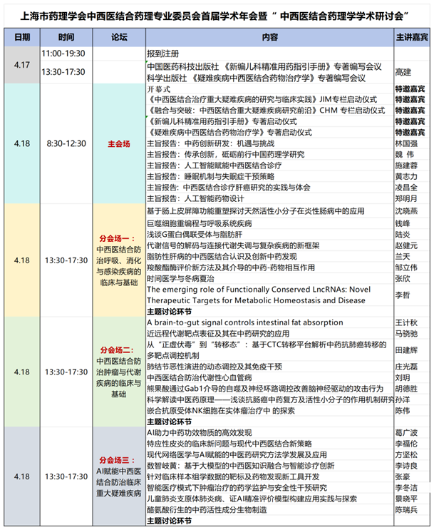本届年会由上海市药理学会主办,上海市药理学会中西医结合药理专业委员会和上海交通大学医学院附属上海儿童医学中心承办,旨在搭建一个高水平、前瞻性的交流平台,汇聚智慧,共谋发展。会议将重点关注“AI赋能中西医结合临床与基础的融合创新”这一核心议题,并特设以下三个专题分会场进行深入研讨: